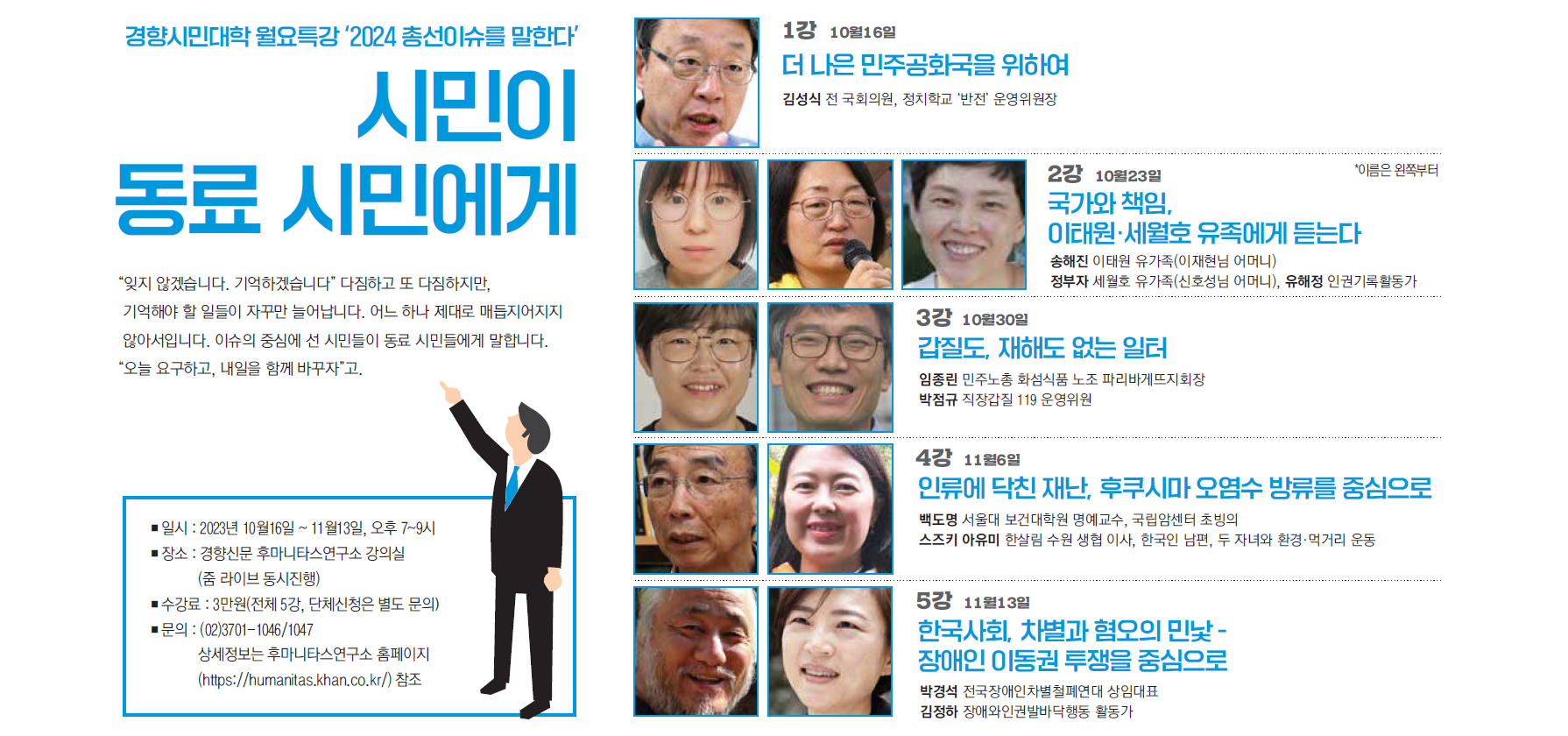 ▶ 월, 시민이 동료 시민에게 (월요특강 ‘2024 총선이슈를 말한다’) 10월16일~ 11월13일(5강) 수강료 3만원 ▸1강 (10월 16일) 더 나은 민주공화국을 위하여 / 김성식: 전 국회의원, 정치학교 ‘반전’ 운영위원장 ▸2강 (10월 23일) 국가와 책임, 이태원· 세월호 유족에게 듣는다 / 송해진: 이태원 유가족, 정부자: 세월호 유가족, 유해정: 인권기록활동가 ▸3강 (10월 30일) 갑질도, 재해도 없는 일터 / 임종린: 민주노총 화섬식품 노조 파리바게뜨지회장, 박점규: 직장갑질 119 운영위원 ▸4강 (11월 6일) 인류에 닥친 재난, 후쿠시마 오염수 방류를 중심으로 / 백도명: 서울대 보건대학원 명예교수, 스즈키 아유미: 한 살림 수원생협 이사 ▸5강 (11월 13일) 한국사회, 차별과 혐오의 민낯- 장애인 이동권 투쟁을 중심으로 / 박경석: 전국장애인차별철폐연대 상임대표, 김정하: 장애와인권발바닥행동 활동가 ▶ 화, <영화와 삶이 만났을 때 > (수강료 각 10만원, 2강좌 신청시 16만원) - 강선형의 < 영화와 삶의 태도들 > [10월10~31일, 수강료 10만원] - 이시윤의 < 미야자키 하야오 X 비판이론 > [11월7~28일, 수강료 10만원]