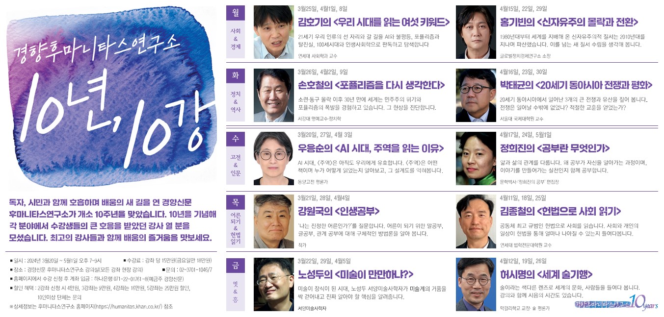 독자, 시민과 함께 호흡하며 배움의 새 길을 연 경향신문 후마니타스연구소가 개소 10주년을 맞았습니다. 10년을 기념해 각 분야에서 수강생들의 큰 호응을 받았던 강사 열 분을 모셨습니다. 최고의 강사들과 함께 배움의 즐거움을 맛보세요.