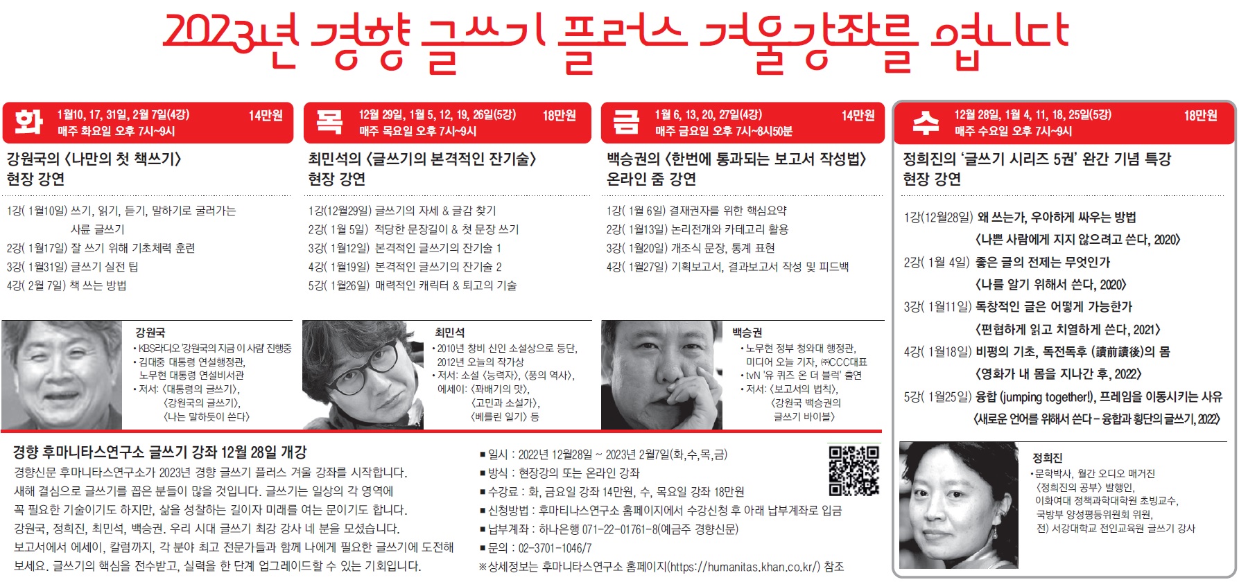 경향신문 후마니타스연구소가 2023년 경향 글쓰기 플러스 겨울 강좌를 시작합니다. 새해 결심으로 글쓰기를 꼽은 분들이 많을 것입니다. 글쓰기는 일상의 각 영역에 꼭 필요한 기술이기도 하지만, 삶을 성찰하는 길이자 미래를 여는 문이기도 합니다. 강원국, 정희진, 최민석, 백승권. 우리 시대 글쓰기 최강 강사 네 분을 모셨습니다. 보고서에서 에세이, 칼럼까지, 각 분야 최고 전문가들과 함께 나에게 필요한 글쓰기에 도전해 보세요. 글쓰기의 핵심을 전수받고, 실력을 한 단계 업그레이드할 수 있는 기회에 여러분을 초대합니다.